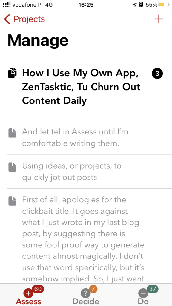 There are two areas in the Assess realm, called “Projects”, and “Ideas”. Every time I have an idea (sic) for a blog post, I quickly jot the title (which may or may note remain the same, in the end) and immediately after, I add “bullet points”, which, in addTaskManager lingo, are called “subtasks”. The whole process takes just as much time as I need to type, it’s basically instant. Sometimes, when I’m in a hurry, I even use iOS’s dictating facility, which lets me speak what I want to write, and it gets magically added to the content (now I used the word “magically”).