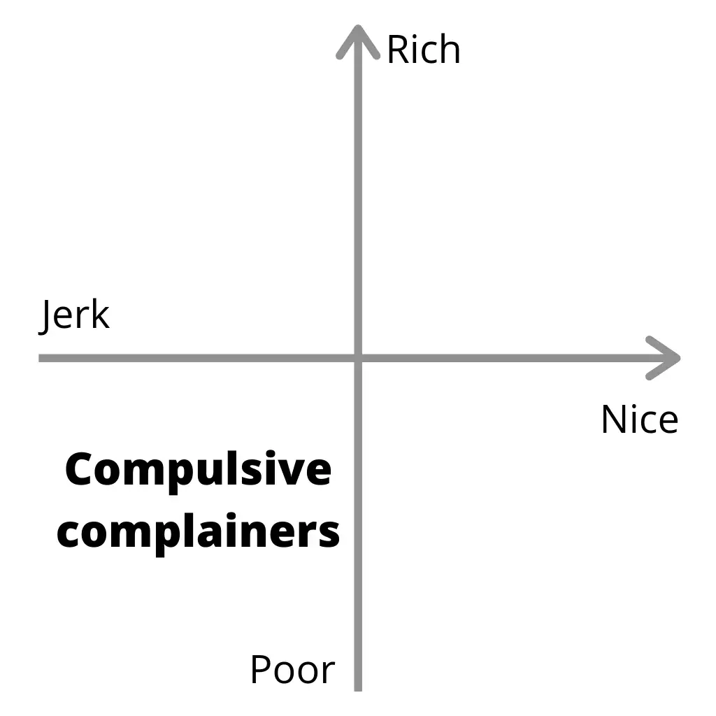 They are the most aggressive observers and arbiters of the quadrant above. They are obsessed with the rich and the jerk, partly because they sharing the “being jerk” approach, partly because they are yearning to get there. They have the intuition that money will greatly amplify them in any direction.