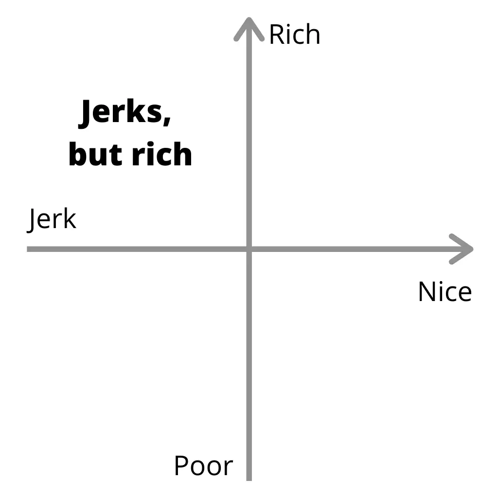 The vertical axis is about how much money somebody has. It’s basically a scale between filthy rich and dead poor. The horizontal axis is about how nice somebody can be. At its lowest, we see absolute jerks, and at its highest we see really nice persons.