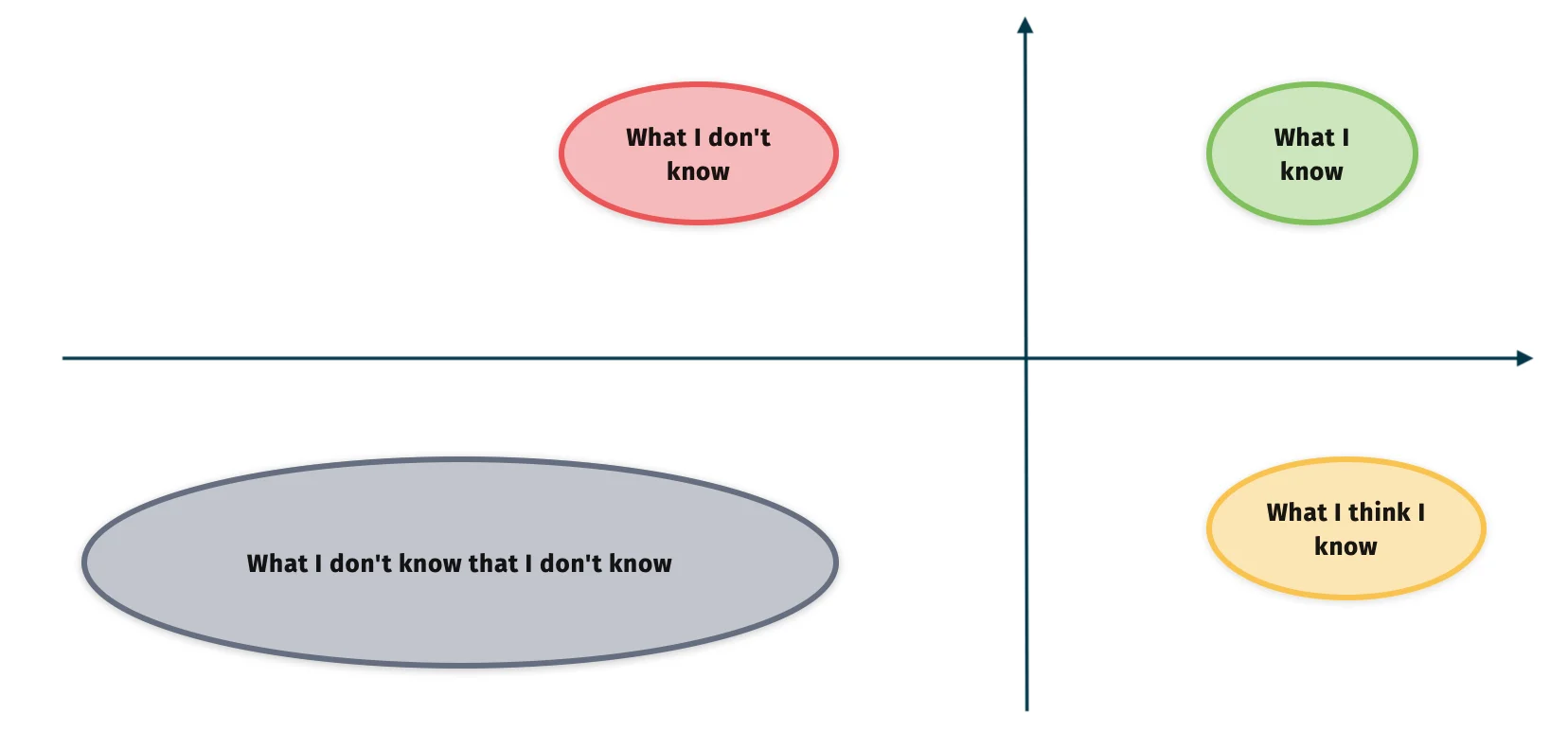 When we advance from the bottom left part (ignorance) to the bottom right part (assumption) we start formulating theories and generate a feedback loop. We go from not knowing that we don’t know something, to believing that may actually know a little bit.